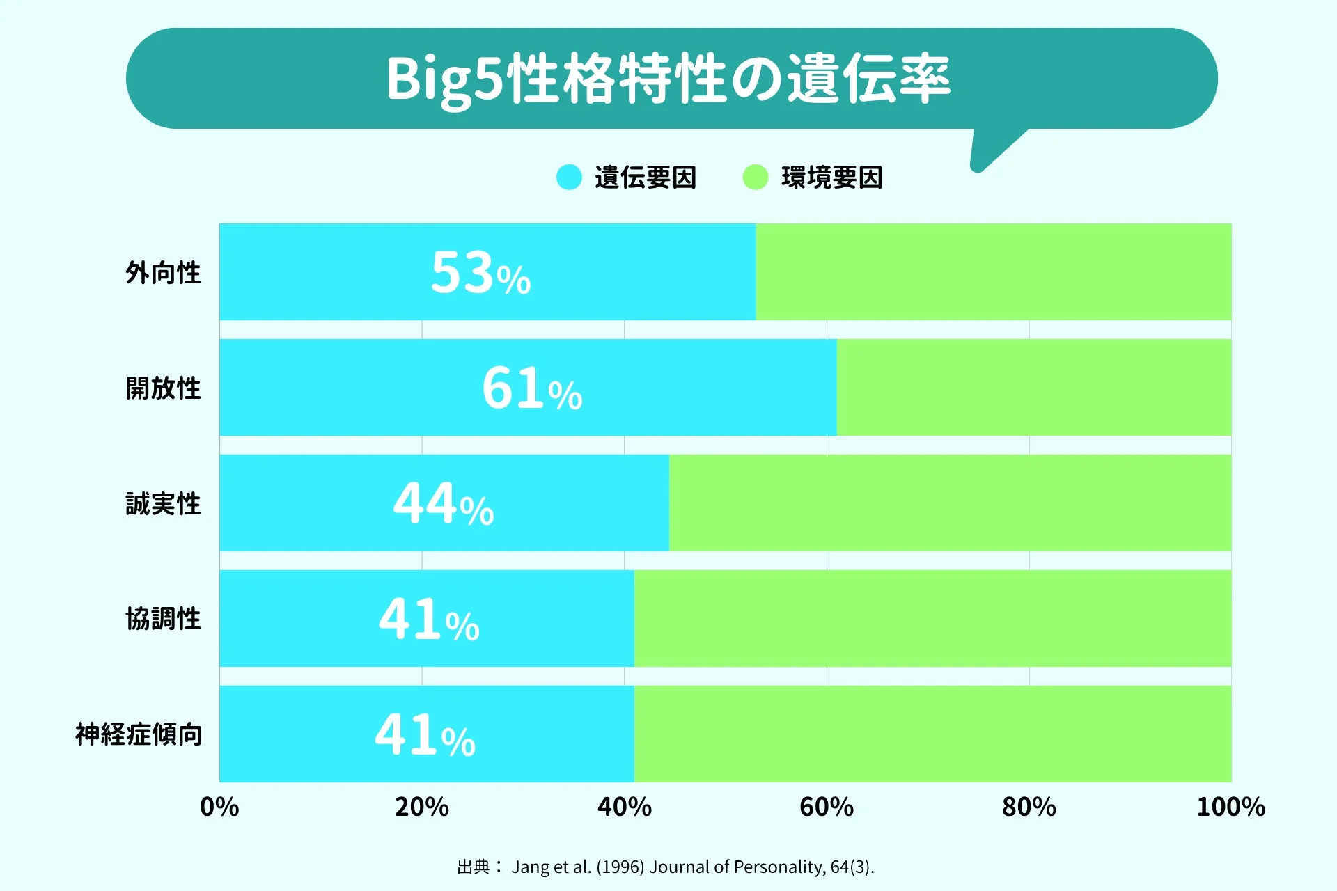 心理学の標準モデルである「Big5」を用いた研究では、性格特性の40~60%に遺伝的要因が関与しているとされています。特に、新しいことへの挑戦や柔軟な対応に関わる「開放性」の遺伝率は約6割と高く、適応のスピードやストレスの感じやすさには生まれつきの性格が影響していると考えられます。