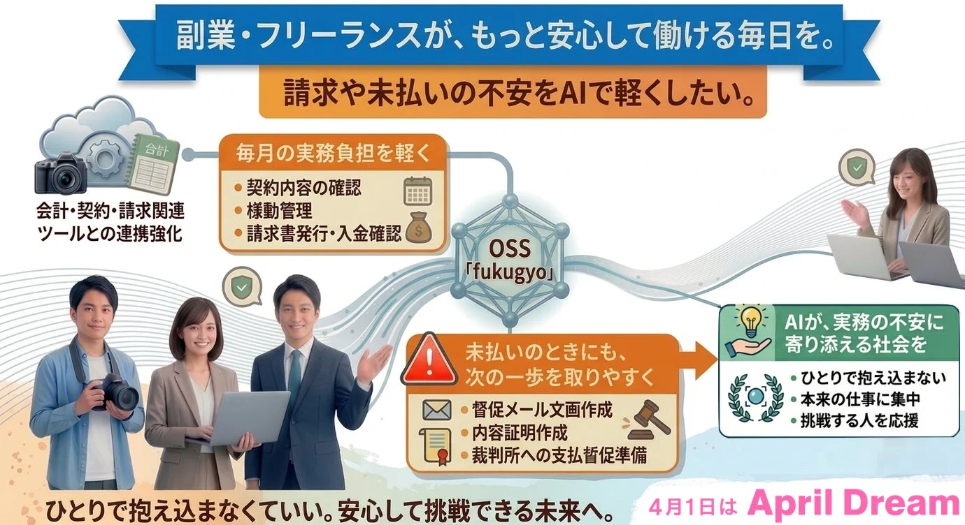 開発の背景には、個人事業主が未払い案件に直面した際の督促、証拠整理、内容証明作成、そして裁判所提出準備に至るまでの大きな負担が挙げられます。副業やフリーランスの現場では、契約条件の確認、作業時間の記録、請求書作成、入金確認といった事務作業が毎月発生し、これに加えて支払遅延や未払いが発生した場合には、督促文面の作成やその後の法的手続きの準備が、心理的および実務的に大きな負荷となります。このような課題に対し、AIを活用して日々の請求関連業務を効率化し、未払い時の対応を容易にする仕組みの必要性が認識され、「fukugyo」が開発されました。